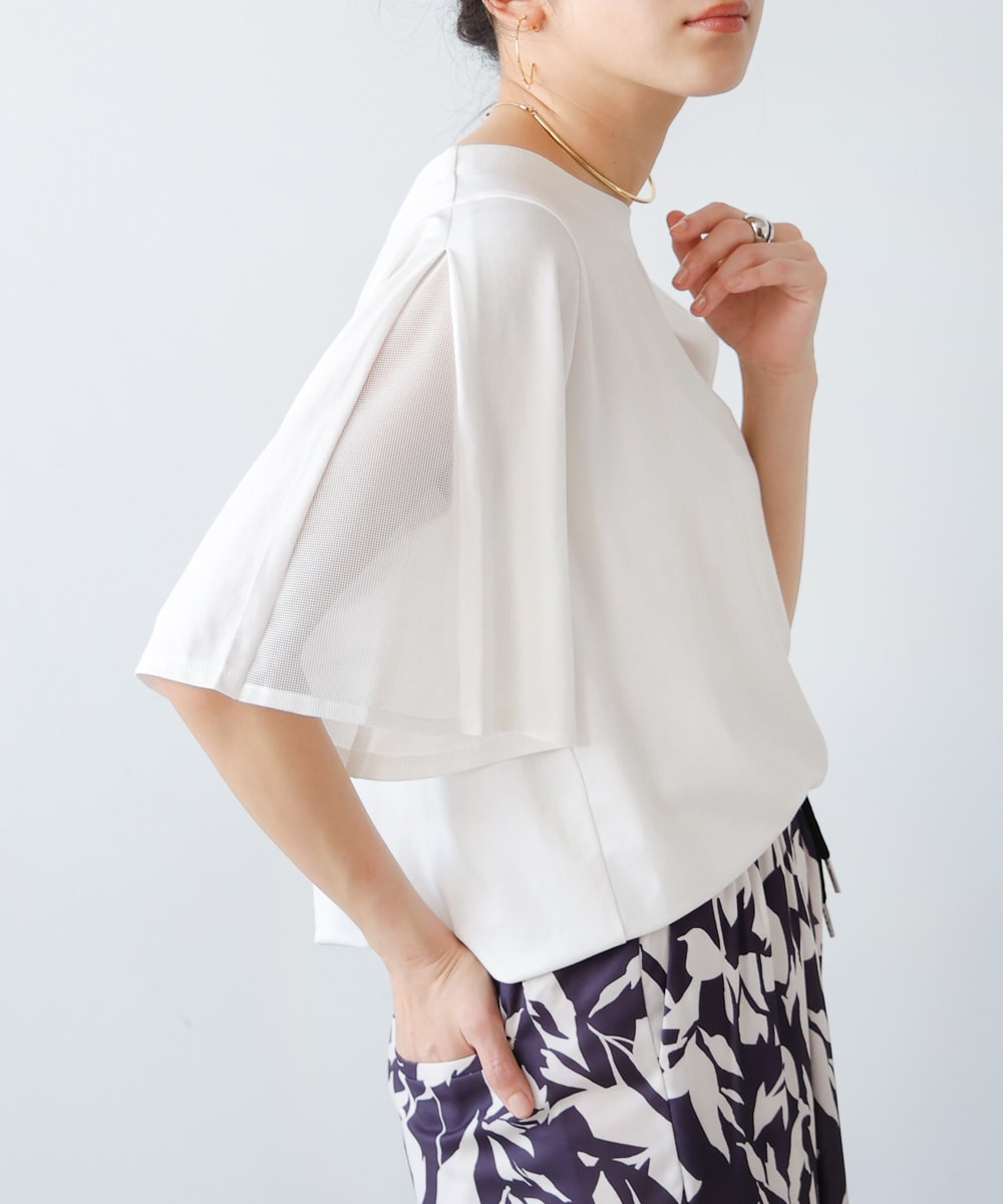 0444 mystic メッシュ袖フレアプルオーバー アイボリー