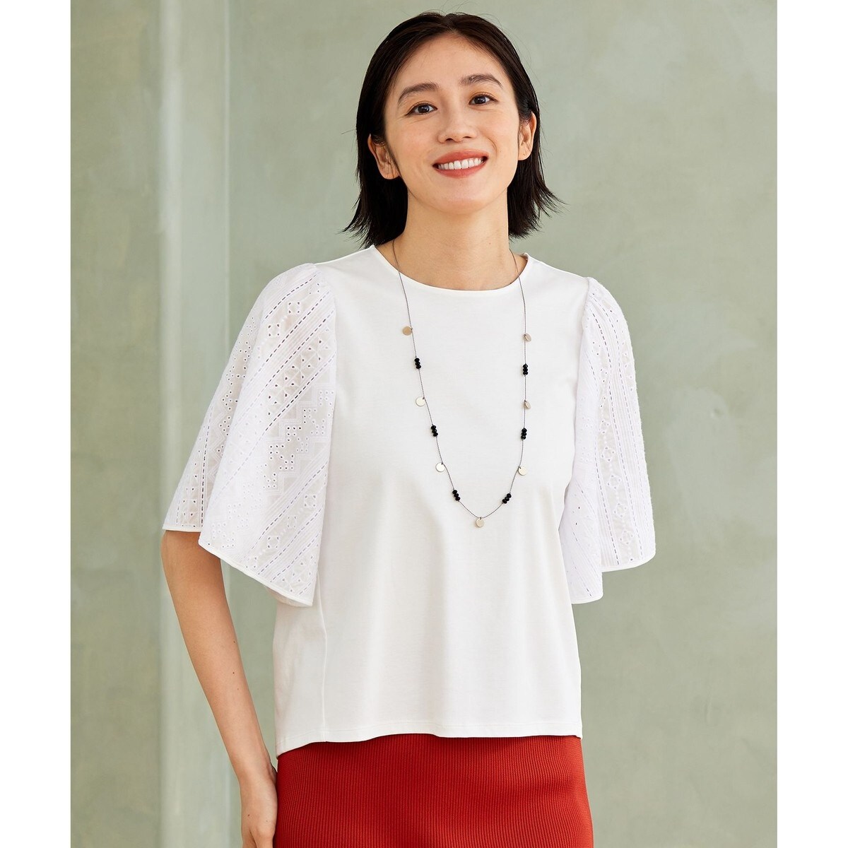 レース柄のフレアスリーブが華やかなカットソー■デザイン華やかで女性らしい袖デザインがポイントのカットソーです。すっきりとしたシンプルな身頃に、オリジナルのレース柄で作成したエンブロイダリーカットワークの生地をたっぷり使用したフレアスリーブが着映えるデザインです。袖に程よくボリュームがあるので、二の腕周りをカバーしてくれます。スカートにもパンツにも合わせやすい1枚です。■素材綿の持つ肌触りの良さに、シルケット加工を施し上品な光沢と適度なハリ感があります。