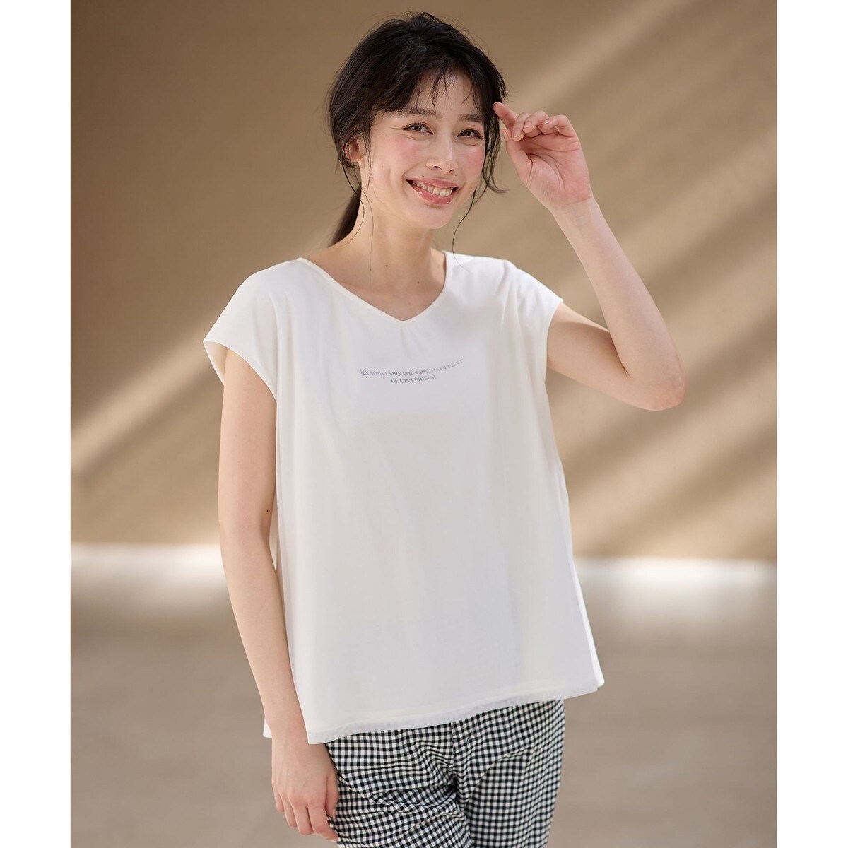 ・華奢な女性らしいプリントを施したカットソーの上に、チュールを被せて透け感を楽しむデザイン