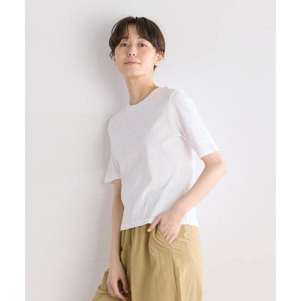 タンクトップ、キャミソールで定番のスビン綿を使用したベーシックな半袖Tシャツ。程良い開きのネックラインや細見えするすっきりとしたサイズ感に拘りました。少し長めの袖丈は二の腕をカバーしながらスタイリングのアクセントに。袖を折り返して表情の変化も楽しんでいただけます。一枚でも、シャツなどのインナーとしても活躍するアイテムです。ソフトで滑らかな肌触りの良い素材を使用しているので、デイリーの着回しにはもちろん、おうち時間にも最適です。・水洗い可《スビンとは》宝石の綿とも言われるSUVIN(スビン)綿は、243番以上(糸の細さ)綿糸を紡績できる繊維の長さと繊度の細さが特徴です。細く長い繊維のため糸の構成本数が多くなり強度、伸度をより高いレベルにまですることができます。この糸だからこそ適応できる高密度での編み、特殊な加工により、限りなく美しく、優しく、そして強い素材になっています。