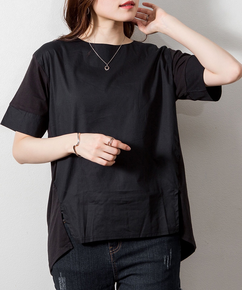 フロントと袖にシャツ生地(ポプリン)を使用したシンプルカットソー。