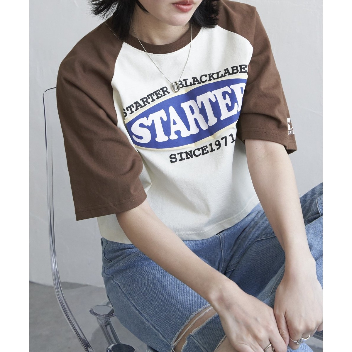 「STARTER BLACK LABEL」のショート丈Tシャツ。