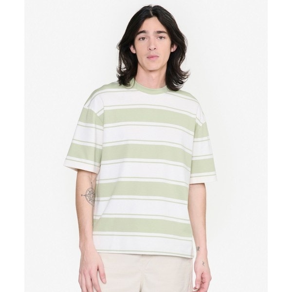 柔らかなカラーリングとレトロな質感の幅広ボーダーが特徴的な、オーバーサイズTシャツです。オーガニックコットン100%を使用したリラックスフィットで着心地も快適。袖口にはボディと同色の刺繍ロゴを施しました。