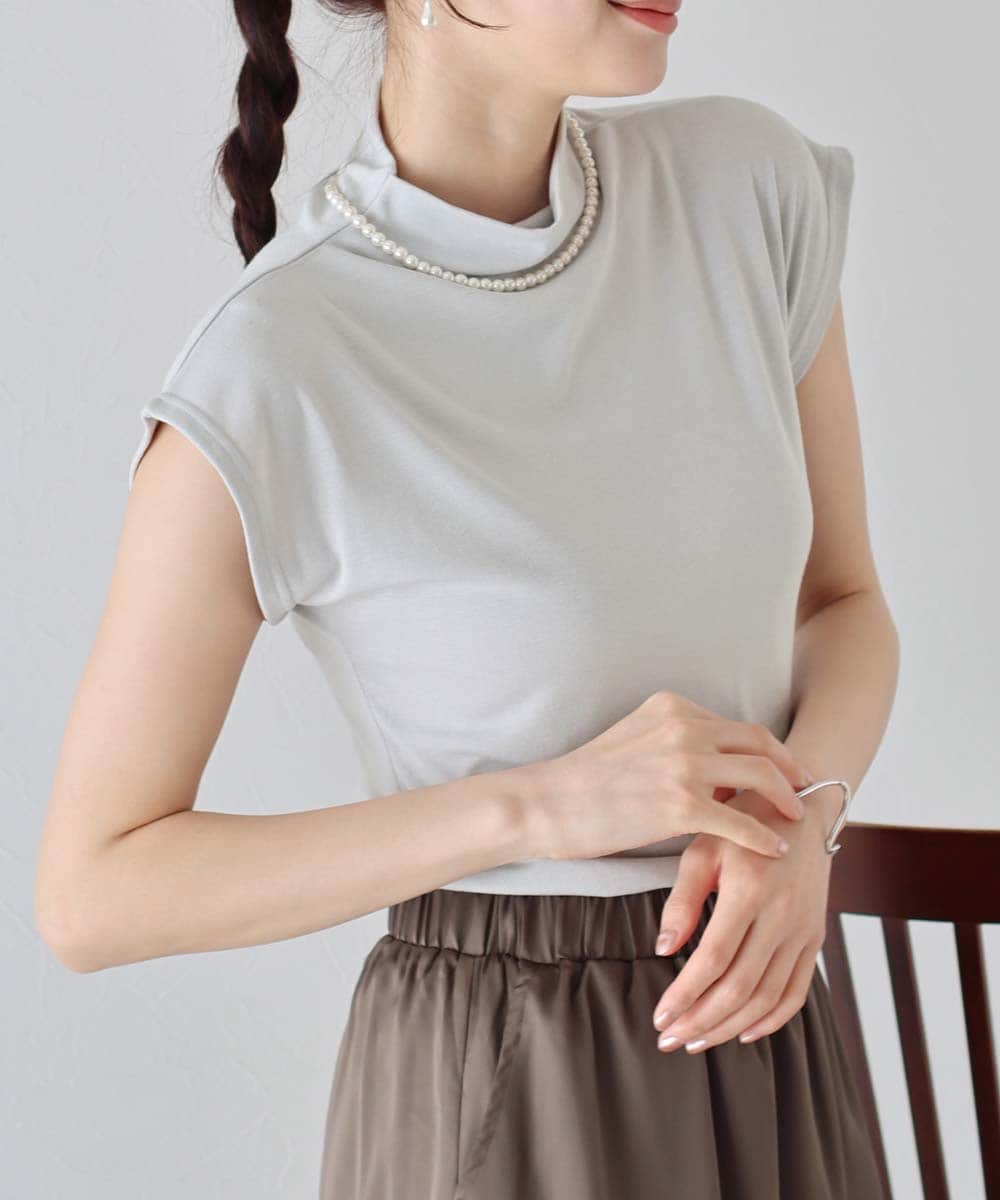 フレンチスリーブとハイネックデザインでフェミニンなムードを演出し、
