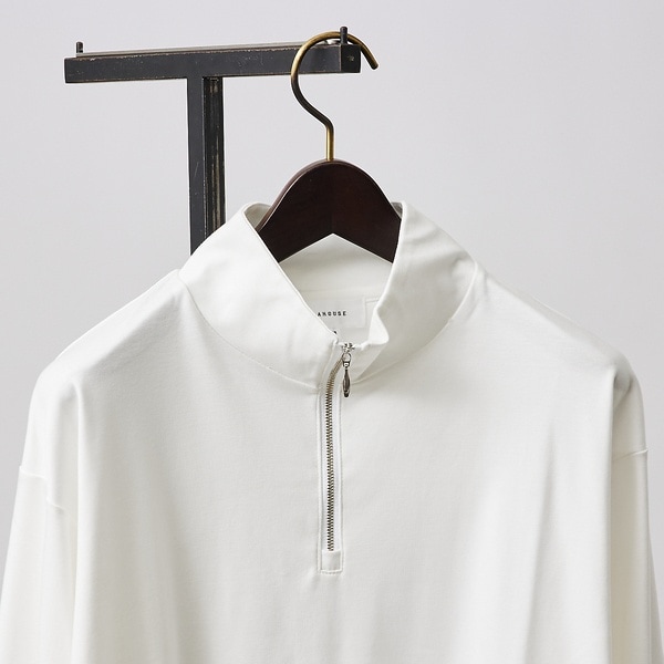 スタンド衿で小ぶりなZIPがついたハーフジップタイプ。良質な着心地でミニマムに洗練された印象に。程よくゆとりのある身幅でリラックス感がある一着。