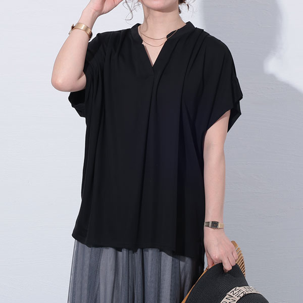 二の腕を華奢見せするフォルムと、わきを見せない仕様のスリーブが魅力的なトップスです。ドルマンシルエットでゆとりを持たせたデザインで体型を拾わずゆったりと着用できます。首元はスキッパーデザインでこなれ感をプラス。接触冷感の生地で肌触りも良く着心地抜群です。汗ばむ時期におすすめの1枚です。