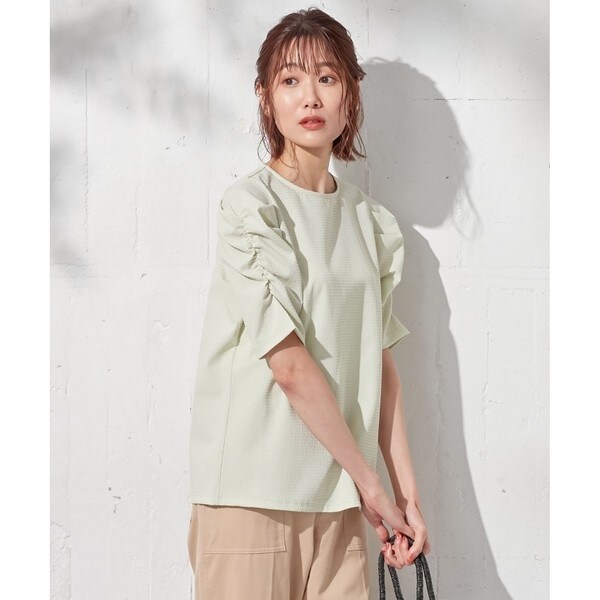 ■デザイン 袖のギャザーが目を惹く、デザイントップスです。シンプルなアイテムにさり気なくディテールが入った一枚映えアイテムでスカートにもパンツにもボトムスを選ばす着られます。キレイ目にもカジュアルにも使えて、さらっとした素材なので春から秋まで長く使える優れものです。ベーシックなアイボリー、ネイビー、アクセントカラーのグリーン、イエロー、ブルーの5色展開です。
