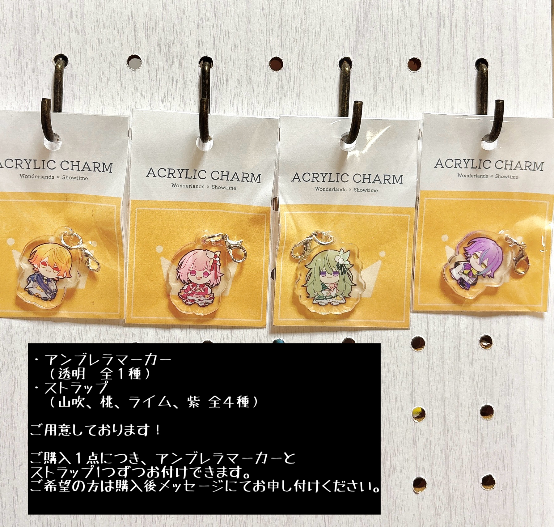 約3cmのミニアクリルチャーム1点につきストラップとアンブレラマーカー1つずつお付けできます。ご希望の方は購入後メッセージにてお申し付けください。