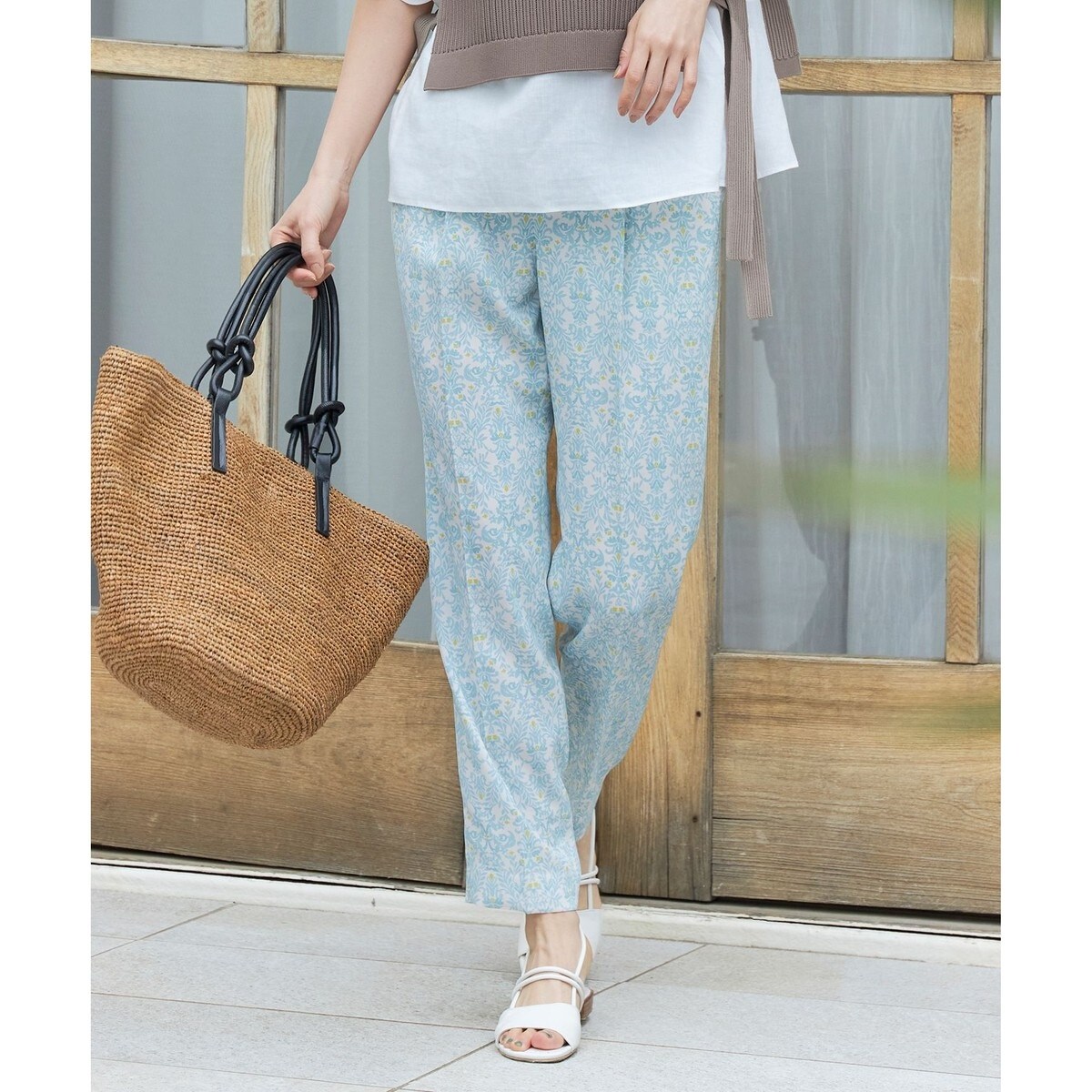コーディネートに取り入れやすい柄パンツ■デザイン花や葉などの植物、幾何学模様をおり交ぜた繊細なアラベスク調の柄プリントを施したテーパードパンツです。アラベスクは壁紙装飾に用いられる美術様式で、オリエンタル感と上質感を醸し出しています。タック入りですっきりとした印象のテーパードパンツで、太もも周りはゆとりを多めにつけた抜け感を感じるシルエットです。ウエストゴムの入ったドロスト付きのデザインなので、楽な穿き心地もポイントです。■素材適度な膨らみとドレープ性を兼ね備えた中肉素材で、さらっとした肌触りとシワになりにくいのが特徴です。■同素材アイテムスカート(SKWMCM0510)