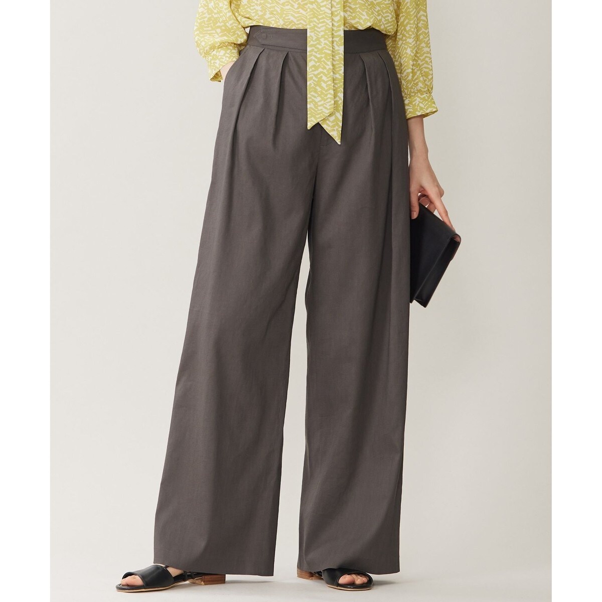 デザイン性と上品さを兼ね備えたリネン混のワイドパンツ■デザインシンプルに大人っぽく仕上げたタック入りワイドストレートパンツです。ウエストのディティールをグルカパンツを彷彿とさせる形状でデザインしつつ、バックル等のカジュアルなディティールを入れないことで程よいデザイン性と上品さのある大人のカジュアルパンツに仕上げました。腰周りにはタックを入れ程よいゆとりがあり、足先に向かってすとんと落ちる綺麗なシルエットです。シンプルなトップスと合わせて辛めのコーディネートから、刺繍やボリューム感のあるパフスリーブのフェミニンなブラウスを合わせた甘辛コーディネートまで幅広く活躍するパンツです。■素材リネンとビスコースを交織したストレッチ素材です。リネン特有のナチュラルな表情とドライでさらっとした風合いが大人っぽく、盛夏に向けておすすめの素材です。特殊な柔軟加工を施し、ドライなタッチは残しながらもしなやかでソフトなタッチに仕上げています。■同素材アイテムスカート(SKW7CM0404)ジレ(VRW7CM0404)
