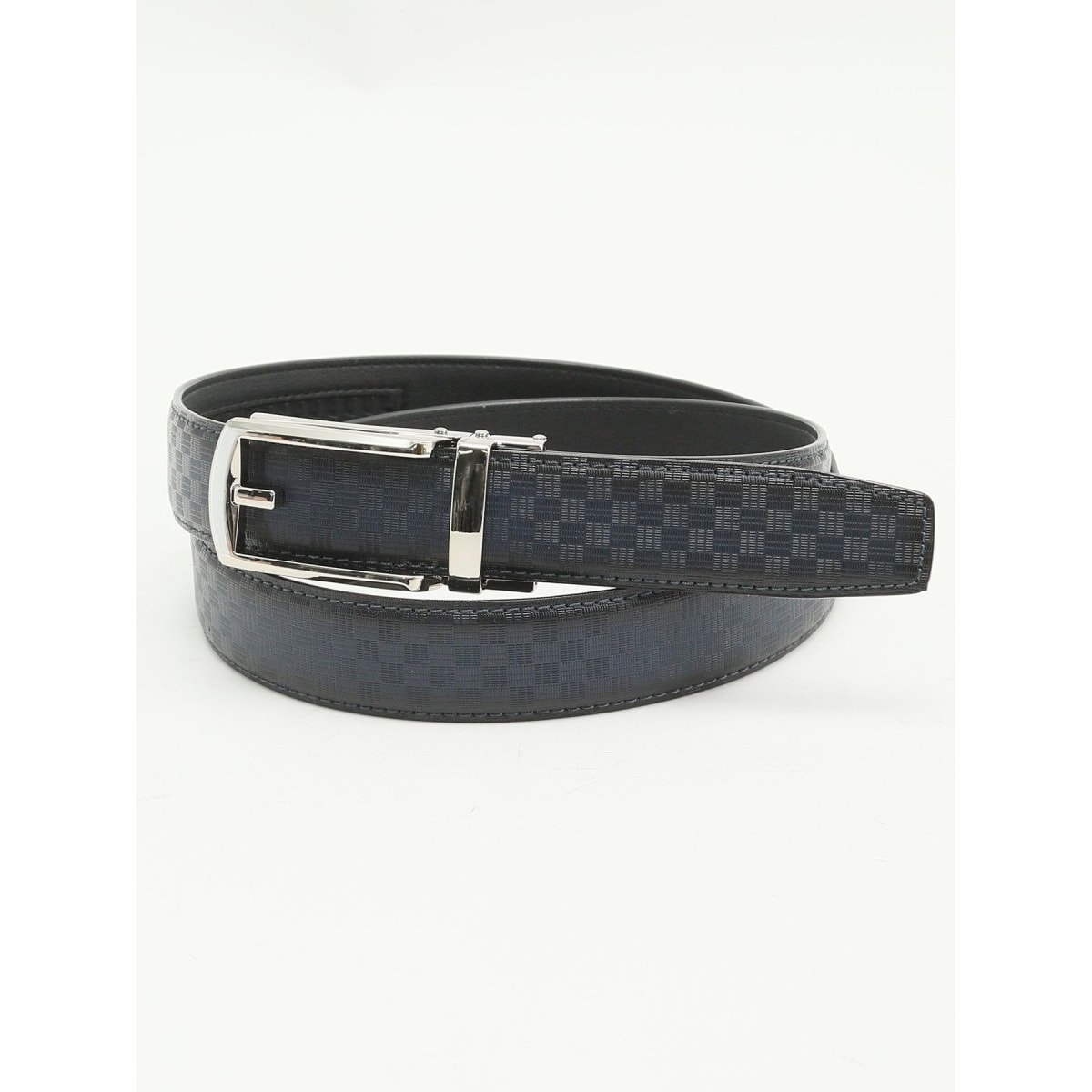表側は市松模様の型押しをほどこした牛革レザー、裏側は合成皮革です。スクエアバックルでスタイリッシュに仕上げています。シックな大人の男の装いを引き立ててくれる上質感が魅力です。