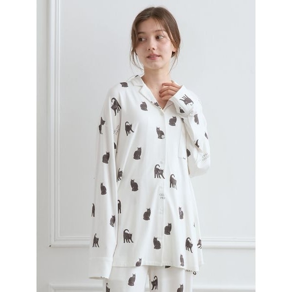 今年のHALLOWEEN COLLECTIONは、黒猫をテーマにした女子ライクなモノトーンスタイル。お座りポーズから、猫好きの方にはたまらない威嚇ポーズまで、表情豊かな黒猫を総柄プリントした柔らかなカットソーシャツです。猫の耳にパープルをあしらったハロウィンらしいカラーリング。胸ポケットにはキラリとしたシルバーの刺繍ロゴを入れました。同シリーズのロングパンツやニットウェアと組み合わせてお楽しみください。