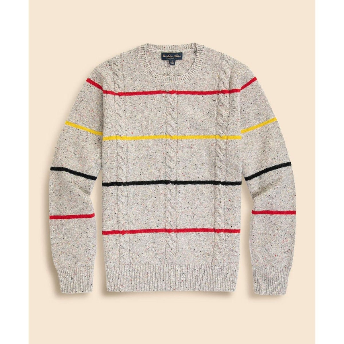 アイルランド・ドネガル地方発祥のドネガルセーターは、カラフルなネップの見られる豊かな色合いと、温かみのある素朴な質感が魅力。太めのケーブル編みを広いピッチで配置し、鮮やかなマルチストライプを加えることでグラフィカルなアクセントを効かせました。コーデュロイパンツやフランネルトラウザーズに合わせて着用したい、秋冬のコーディネートの主役になるアイテムです。