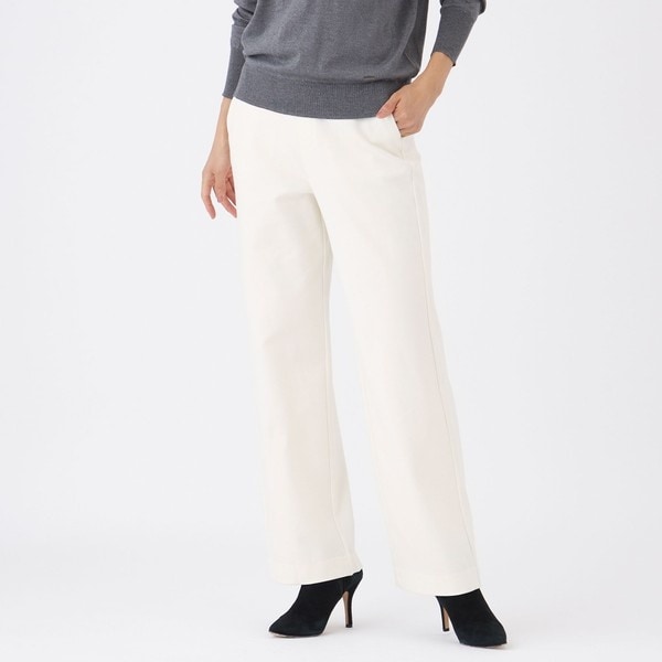 膝から裾まで真っすぐに落ちるストレートシルエットが美しい、ワイドストレートパンツ。一般的なワイドボトムよりも4-5cm程細いややワイドな裾幅の新しいシルエットにこだわりました。ワイドのニュアンス感や体型カバー力、ストレートのスッキリ感や合わせやすさをいいところ取りした万能ボトムです。ちょうどいいバランスがトップスの着丈を選ばず、着回しのきく優秀アイテム。素材のストレッチ性に加え、ウエストは総ゴム仕様なのでよりラクチンな穿き着心地です。