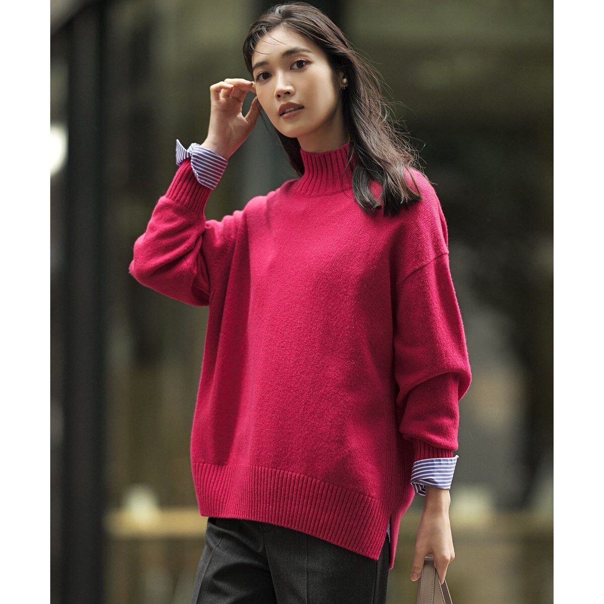 顔周りをすっきりと見せてくれる、程よいゆとりのある襟ラインが魅力のハイネックニット。サイドには編地切り替えとスリットを施し、さりげないアクセントとメリハリをプラスしました。裾ラインはラウンドさせ、前後差をつけることで、フロントは軽やかな印象に、後ろ身頃は気になるヒップラインを自然にカバー。どの角度から見ても美しいバックスタイルを演出するよう、細部にまでこだわり仕上げています。パンツスタイルにはもちろん、スカートと合わせても上品にまとまり、オンオフ問わず幅広いシーンで活躍する万能ニットです。カラーは、クリーンで洗練された印象のホワイト(#001)、どんな色とも相性が良いライトグレー(#003)、着こなしに深みを与えるグレー(#004)、華やかで女性らしいマゼンタ(#014)、優しく柔らかな印象のベージュ(#033)、知的で洗練された雰囲気のピーコックグリーン(#061)、爽やかで明るい印象を与えるライトグリーン(#062)の7色展開に加えて、さらに見上愛さんとのコラボカラーとして新たに2色が仲間入り。華やかさと洗練された雰囲気を兼ね備えたパープル(#080)と、こなれ感を演出するブルーグレー(#074)が、秋冬のワードローブに欲しい、装いのアクセントカラーとして活躍します。