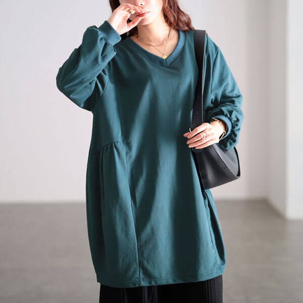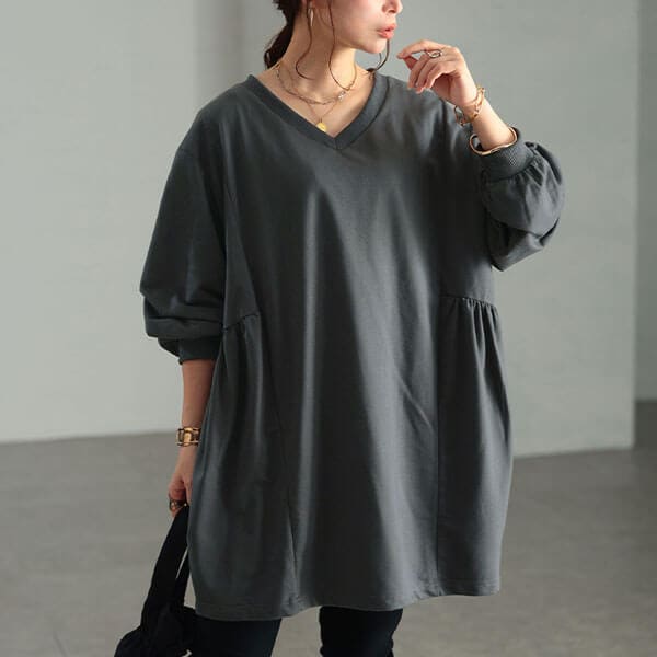 こだわりのギャザー切り替えがシンプルに着映える、脇ギャザー切り替えコクーンチュニックの登場です☆立体感のあるデザインでシンプルなデザインながらもワンランクアップのコーデに仕上がる!体型を拾わないゆったり身幅&袖幅でゆとりのあるサイズ感でリラクシーな着心地☆お尻がすっぽり隠れる長めの着丈で気になるヒップラインをカバー♪どんなボトムスにも合わせやすいシンプルデザインで着回し力抜群◎