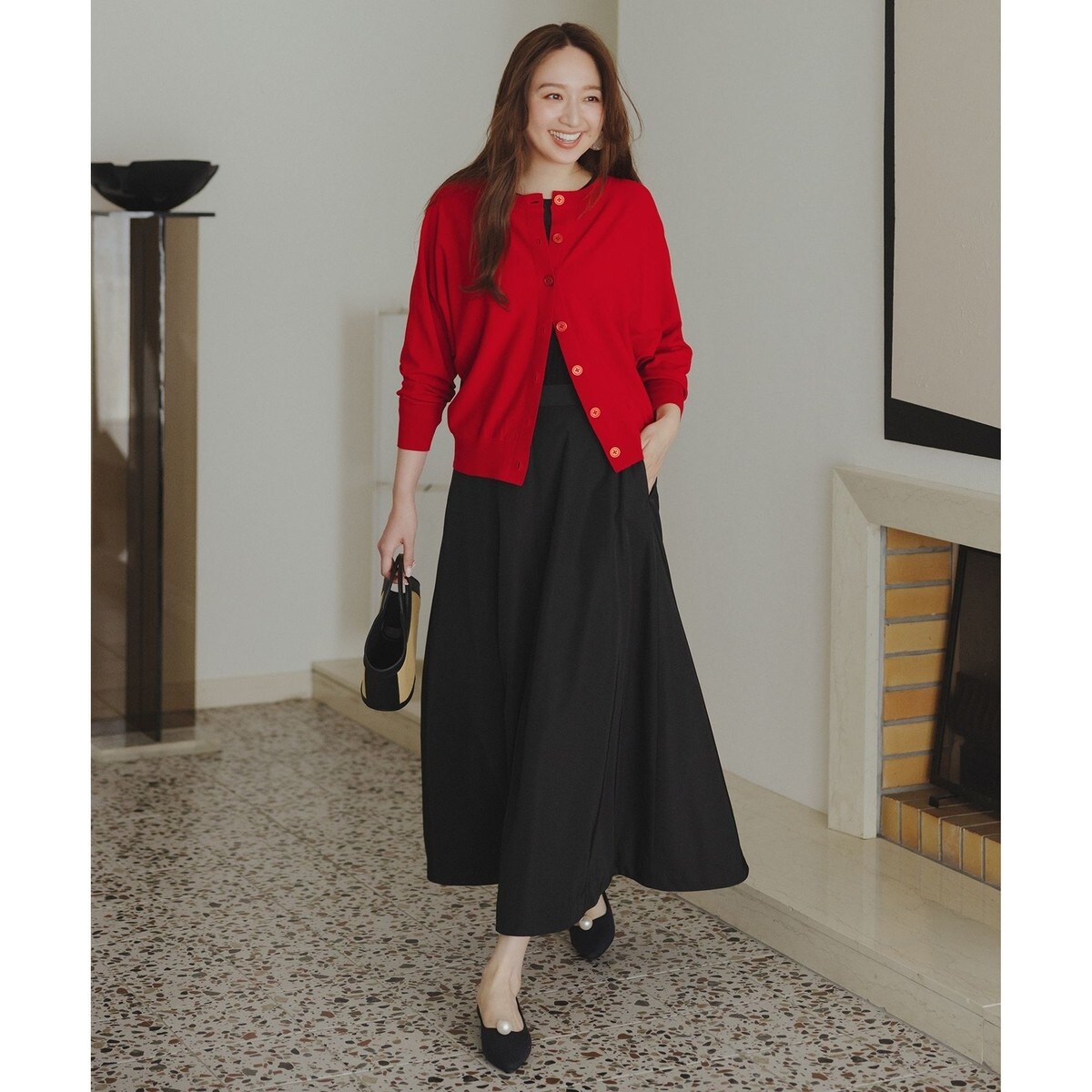 ■素材控えめな光沢感と、ソフトな風合いが上品なポリエステル素材。表地と裏地の間に薄い中綿を挟み、ふっくらとした張り感を出しました。表地、裏地ともに柔らかく程よく落ち感がある素材を使用したので、広がり過ぎないのがポイントです。