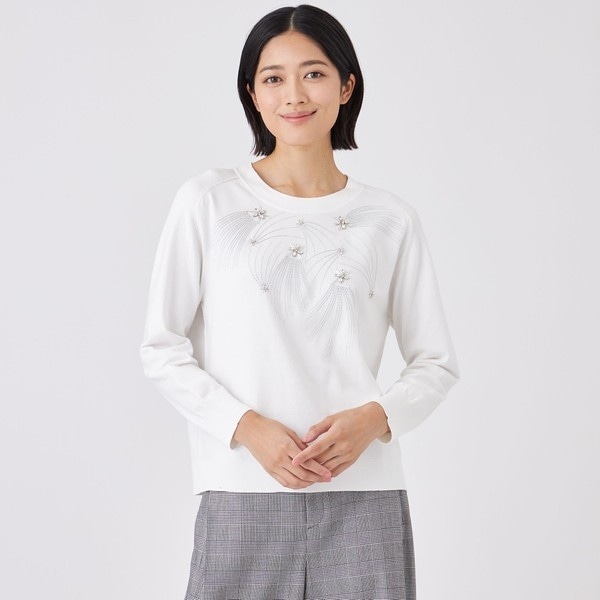 流れ星のモチーフを、煌めくビーズ手刺繍と機械刺繍で表現した意匠性の高いニットプルオーバーです。