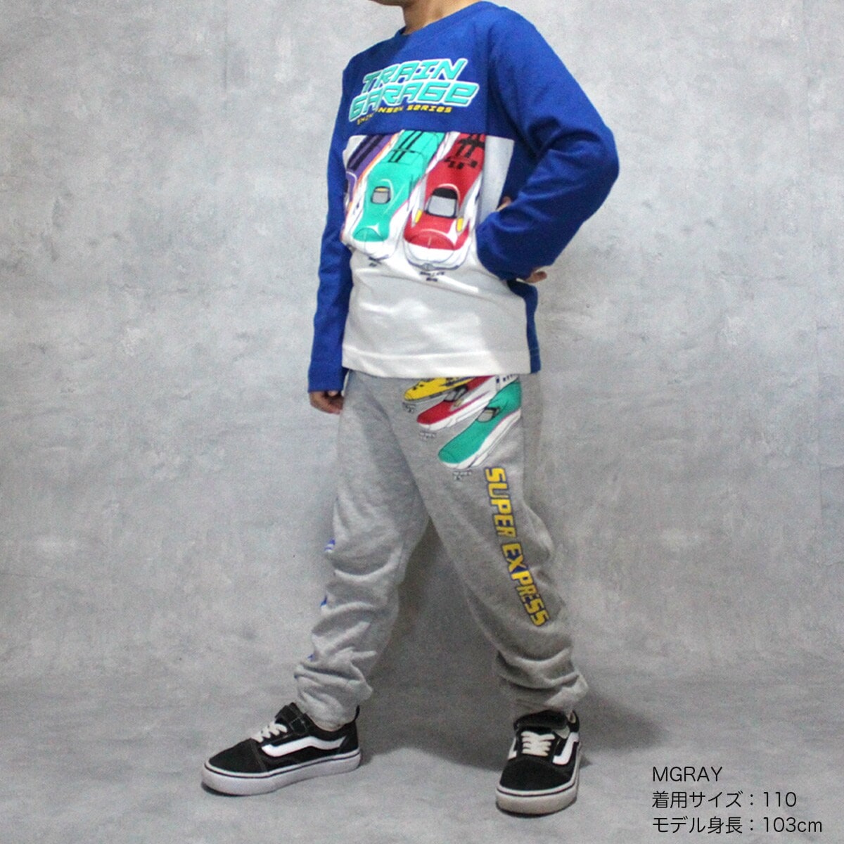 人気の新幹線が並んだ、気分の上がるかっこいいデザインのロングパンツ。