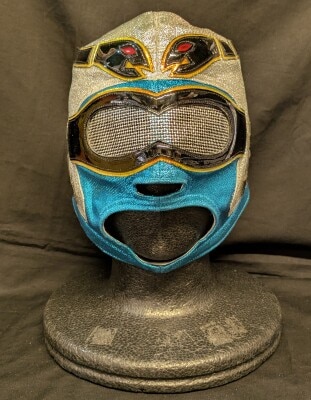 プロレスマスク 【ストゥーカJr.(銀ラメ・水色ラメ生地×金・赤・銀ホロフチ)】 本人使用 着用写真付き サイン入り