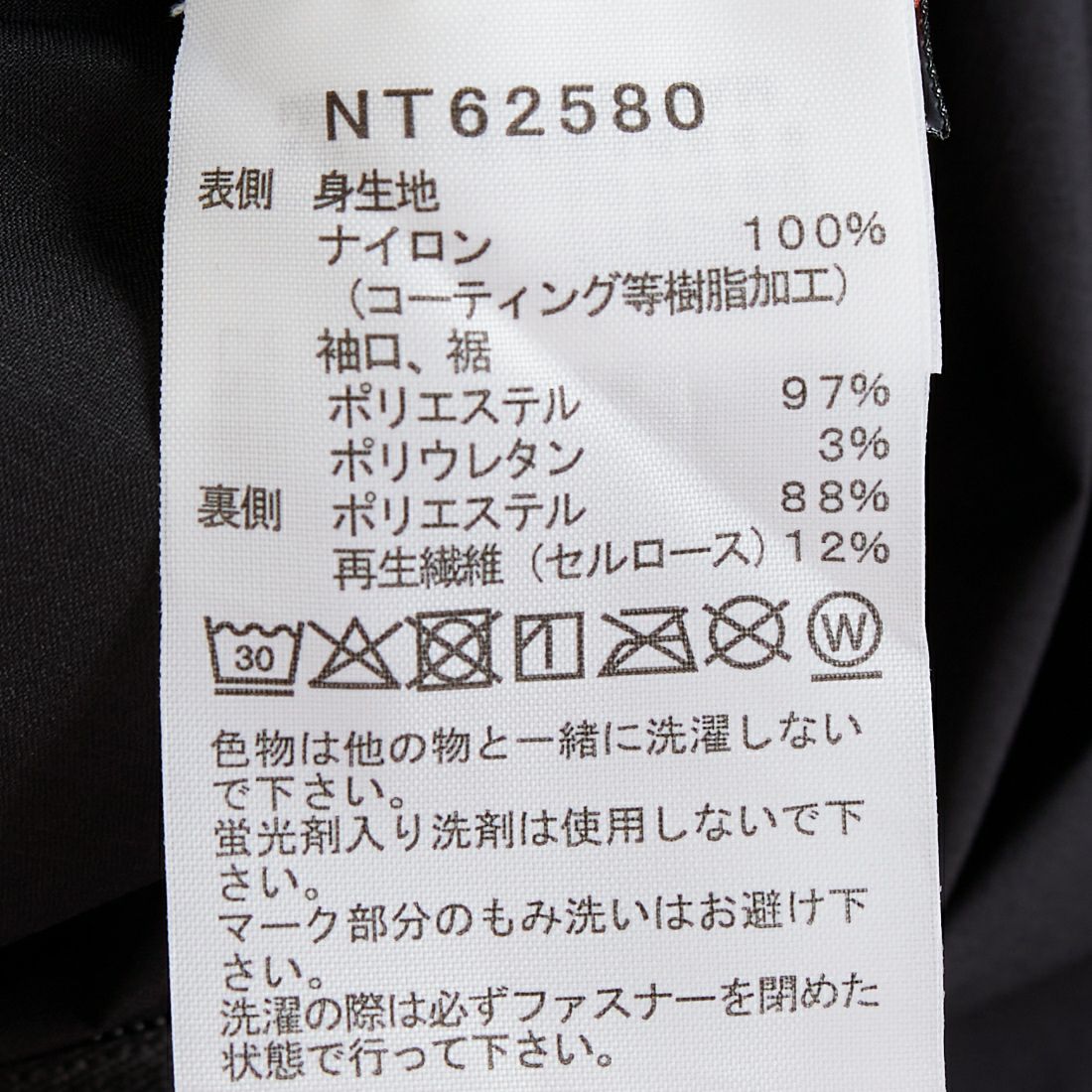 素材 | 表側 身生地 ナイロン(コーティング等樹脂加工) 100% 袖口.裾 ポリエステル 97% ポリウレタン 3% 裏側 ポリエステル 88% 再生繊維(セルロース) 12% |