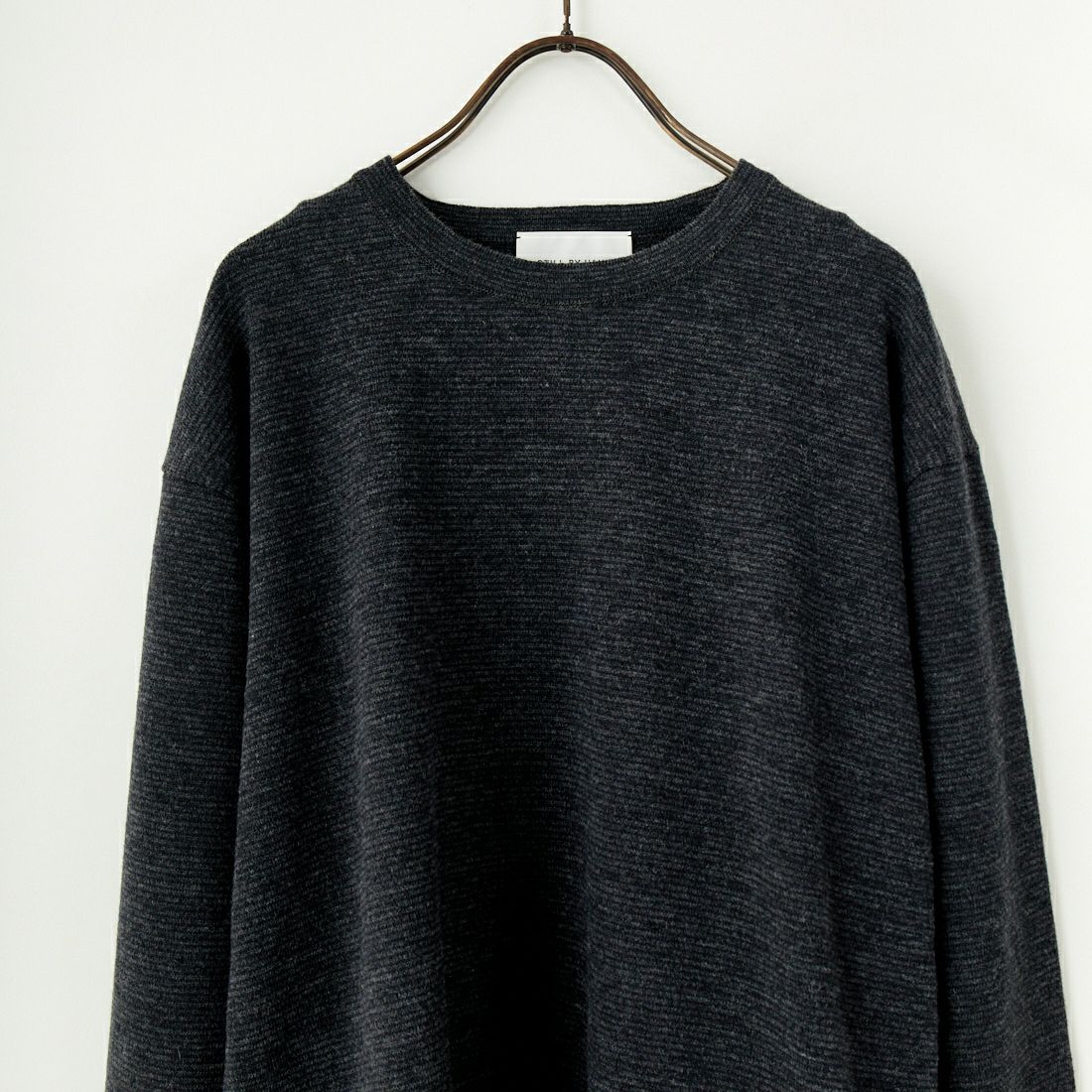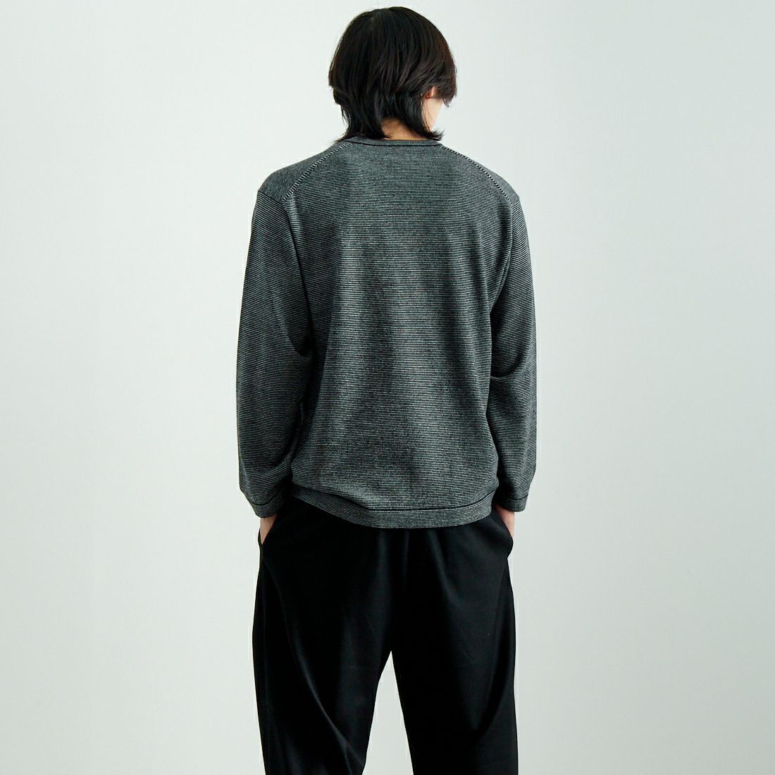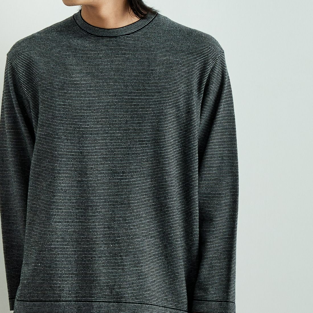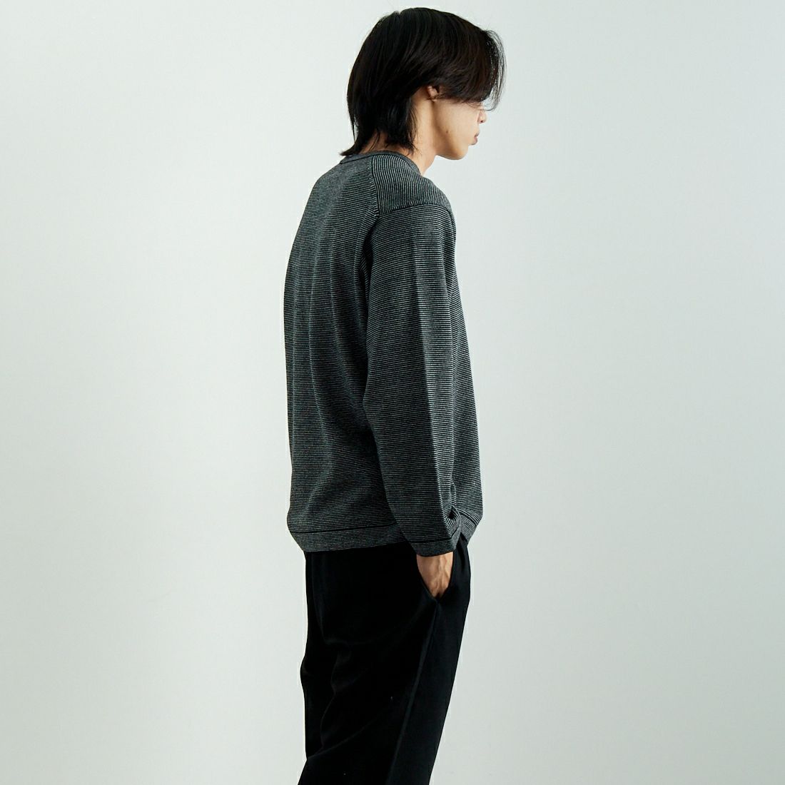STILL BY HAND[スティルバイハンド]のボーダーニット。無地感覚で使えるピッチの細かいボーダーのニットを14ゲージのファインゲージで作成。中空糸のハイゲージを使用しているので、暖かいのにとても軽い仕上がりです。ロンTの様な感覚で着れるニットのため1枚でもインナーとしても重宝します。