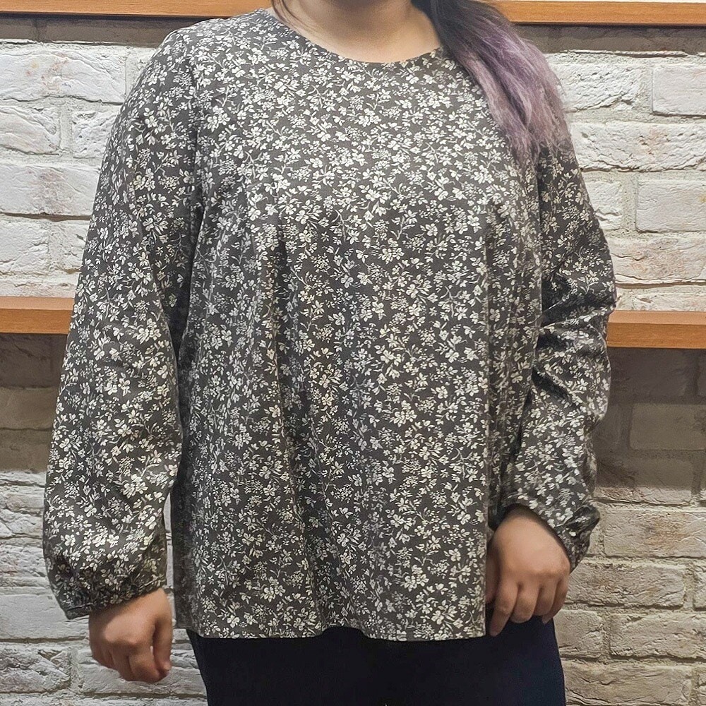 細畝のコーデュロイ生地を使用したブラウスです。美しいフラワープリントが施され、クラシカルな印象を与えつつ、着る人の魅力を引き立てます。肩からのタックによって、お腹周りがゆったりとしたフレアーシルエットを演出し、どんなスタイルにもマッチする優れたデザインです。