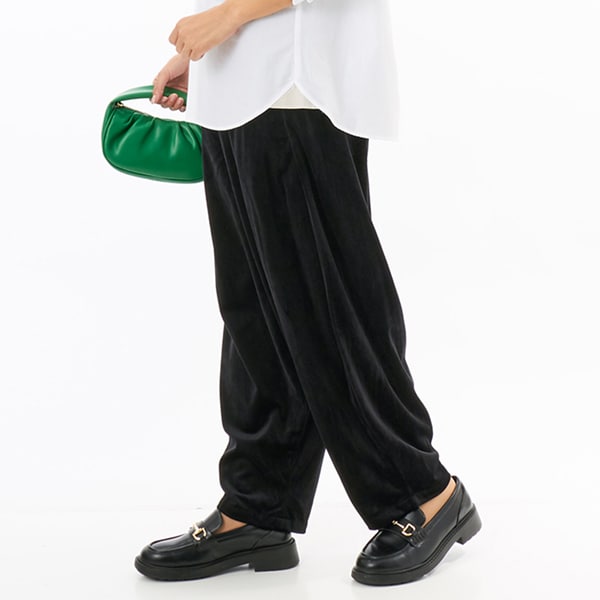 【素材】キレイな光沢としなやかな肌触りが特徴のベロア素材を使ったボトム。【デザイン】ゆったりとしたワイドテーパーシルエットのパンツは裾を細めに設定することで裾にドレープのようなクッションが特徴的なシルエットをつくっています。素材の持つ上品で大人っぽい雰囲気ながらウエストがゴムとヒモでイージーな点がブランドらしくて◎。*0、1サイズですがこちらの商品はユニセックス商品です。【ブランド情報】FRAPBOIS/フラボア2001年にブランドスタート。「大人げない大人の服」をコンセプトに、大人が着るリラックスしたデイリーウェアを提案するコレクションブランド。レディースとメンズのアイテムをご用意しています。
