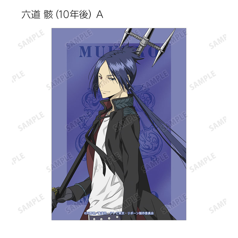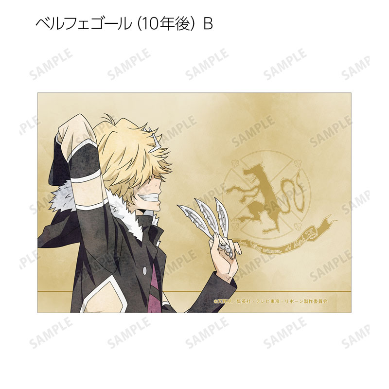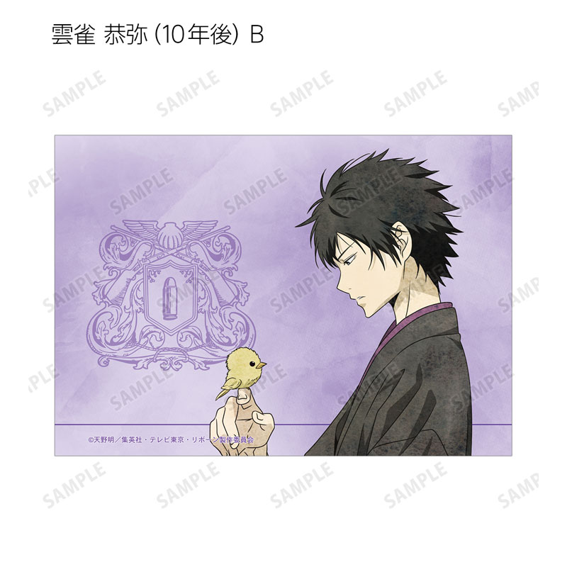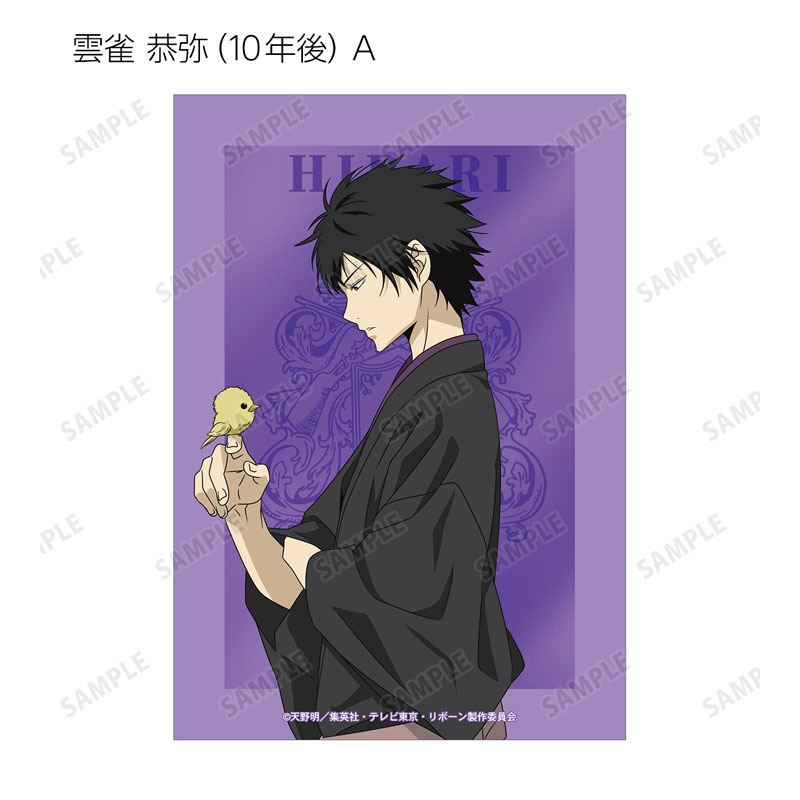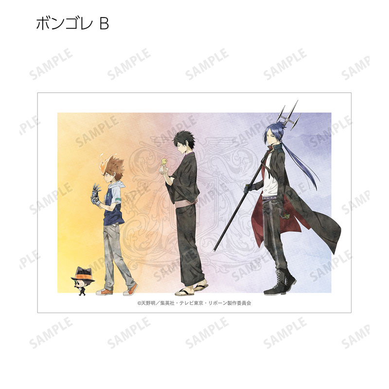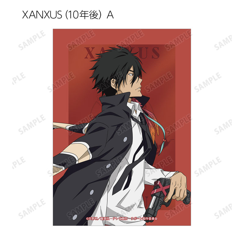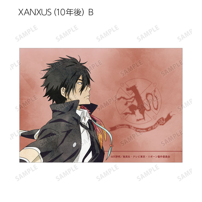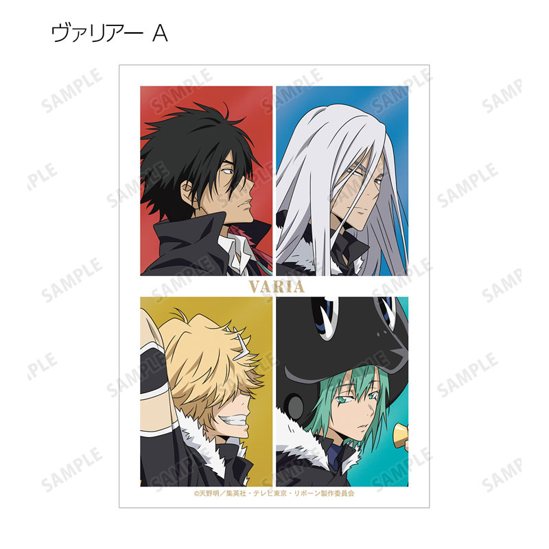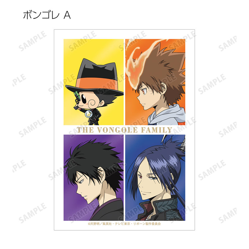 沢田綱吉、リボーン、雲雀恭弥(10年後)、六道骸(10年後)、XANXUS(10年後)、スペルビ・スクアーロ(10年後)、ベルフェゴール(10年後)、フランの描き下ろしイラスト、ボンゴレエンブレム、ヴァリアーエンブレムをブロマイドに仕上げました。