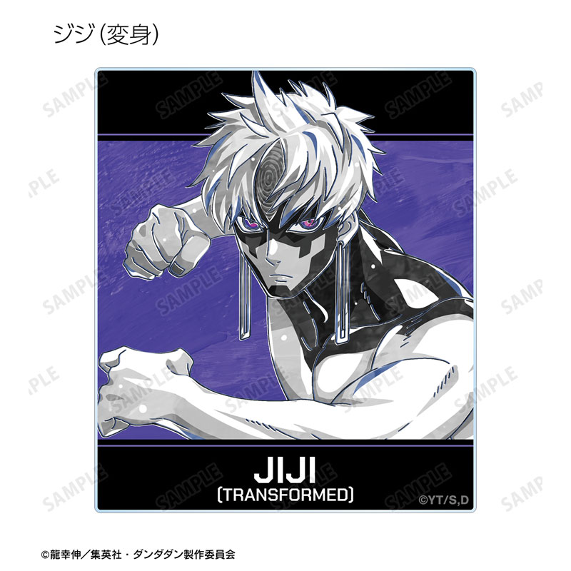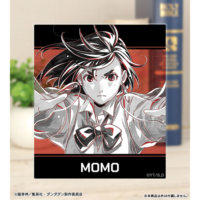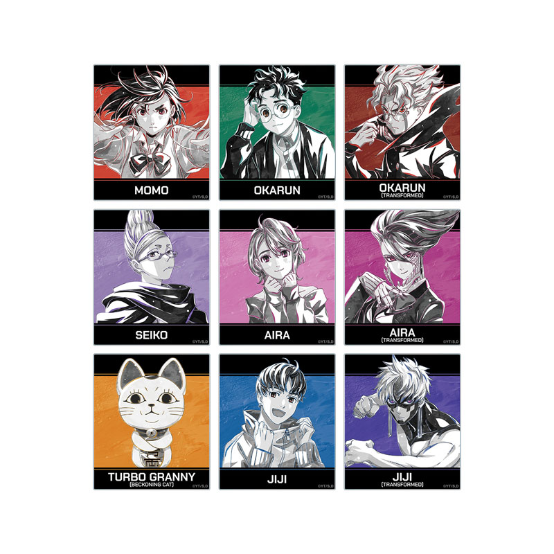 モモ、オカルン、オカルン(変身)、星子、アイラ、アイラ(変身)、ターボババア(招き猫)、ジジ、ジジ(変身)のイラストを新たなタッチで魅力的に表現し、アクリルカードに仕上げました。