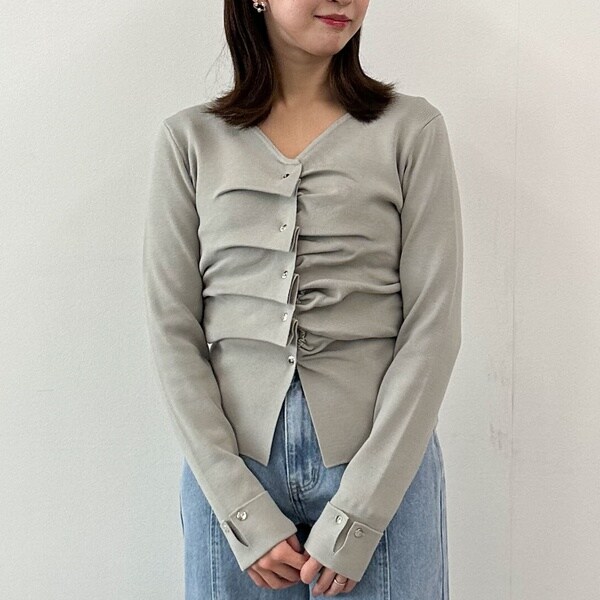 フロントのボタンとタックのデザインが目を引くニット。