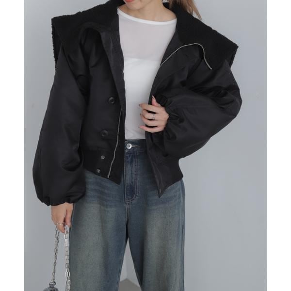 ミリタリーな「N2-B」フライトジャケットを現代らしいフォルムでアレンジした防寒ブルゾン。襟の後ろにZIPをあしらい、閉めるとフードに、オープンにすると二分割され、ボア面が出るデザインです。裏地には中綿入りで軽量ながら防寒にも優れています。きゅっとギャザーを寄せた裾リブで、パフっとしたフォルムがポイント。バルーンスリーブの内側はリブなので、袖口をたくし上げた時のたまり具合が可愛く出るようにしています。アームホールはゆったりめの作りなので、インナーに厚手ニットも着られます。ローゲージのニットやスウェットなどのルーズなトップスに、ミニスカートやワイドパンツを合わせ、カジュアルスタイルやY2Kスタイルがおススメです。※モデルの着用画像の場合、光の当たり具合により、実際の色味と異なって見えることがございます。色味は、商品単体の画像をご参照ください。