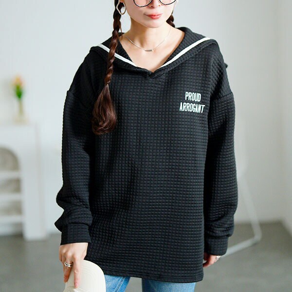 カジュアルコーデにぴったりなセーラーカラーワッフルトップスです。Vネック×セーラーカラーの組み合わせが大人可愛い印象をプラス。胸元や後ろ側の英字デザイン、袖口のリブなど細部までこだわりのあるディテールが魅力。ゆったりとしたドロップショルダーと程よいボリューム袖は二の腕をさりげなくカバー。ヒップやお腹周りも隠れる安心丈とゆるっと感がイマドキっぽいシルエットに。さらっとした着心地で軽やかなワッフル風生地も表情を付け加えてくれます。デイリーからルームウェアまでカジュアルなシーンに使える万能な一枚です。