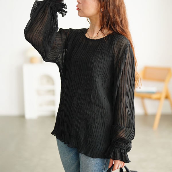 一枚でもレイヤードもおまかせ♪シアープリーツキャンディスリーブプルオーバーの登場です☆体型を拾わないゆとりのある身幅でゆったり楽ちんな着心地◎お尻がしっかり隠れる長めの着丈で気になるヒップラインもしっかりカバー◎透け感のあるウェーブプリーツ生地でトップス・インナーどちらも着まわしていただけます♪袖幅にたっぷりボリュームを持たせているので見た目の可愛さはもちろん、二の腕をしっかり隠してくれるので重宝すること間違いなしの一着です☆
