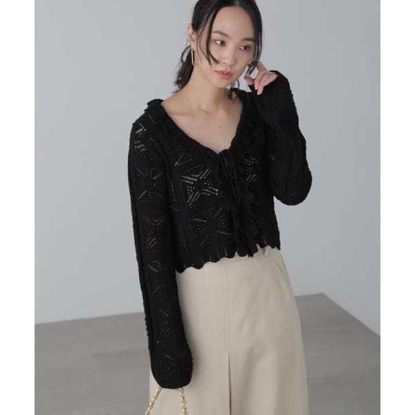 コットン・アクリルのカジュアルな風合いの糸を使った、クロシェ風の透かし編みがクラフト感あるニットカーディガン。襟ぐりにスカラップのフリルパーツを取り入れ、裾端もスカラップで締めています。フロントはボタン仕様で、一番上にはリボンを付けてポイントに。クロップドの丈感と長めの袖丈が今年らしいバランスです。キャミソールやタンクトップ×デニムパンツ合わせがおすすめ。ショートパンツ合わせでリゾートスタイルも楽しめます。ほどよい透かし編みなので春先から着用いただけます。※モデルの着用画像の場合、光の当たり具合により、実際の色味と異なって見えることがございます。色味は、商品単体の画像をご参照ください。
