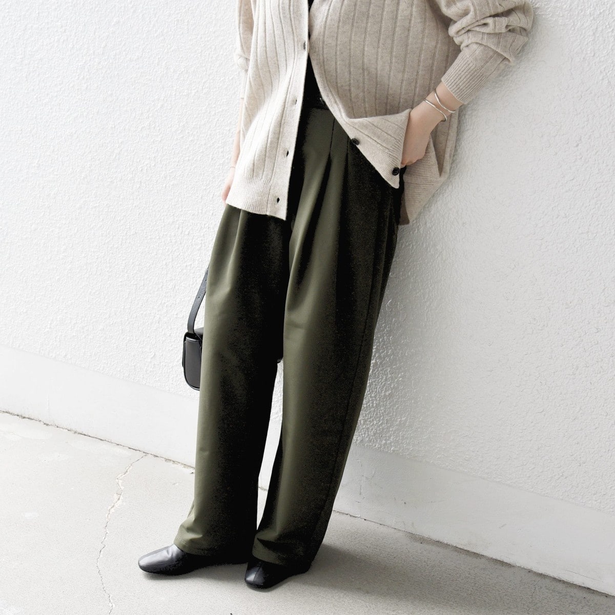 深めのタックをウエストよりやや下の位置から入れているので、腰まわりはゆとりがありつつもスッキリ見えします。