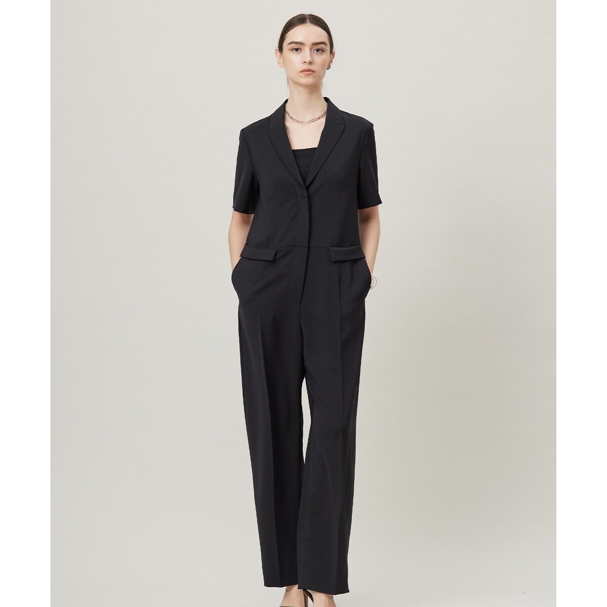 ■デザインマニッシュな印象のテーラーカラーのオールインワンです。スッキリとしたウエストライン、センタープレス入りで脚のラインをキレイに見せるなど、女性らしいシルエットにもこだわっています。一枚で着映えする存在感のあるオールインワンです。