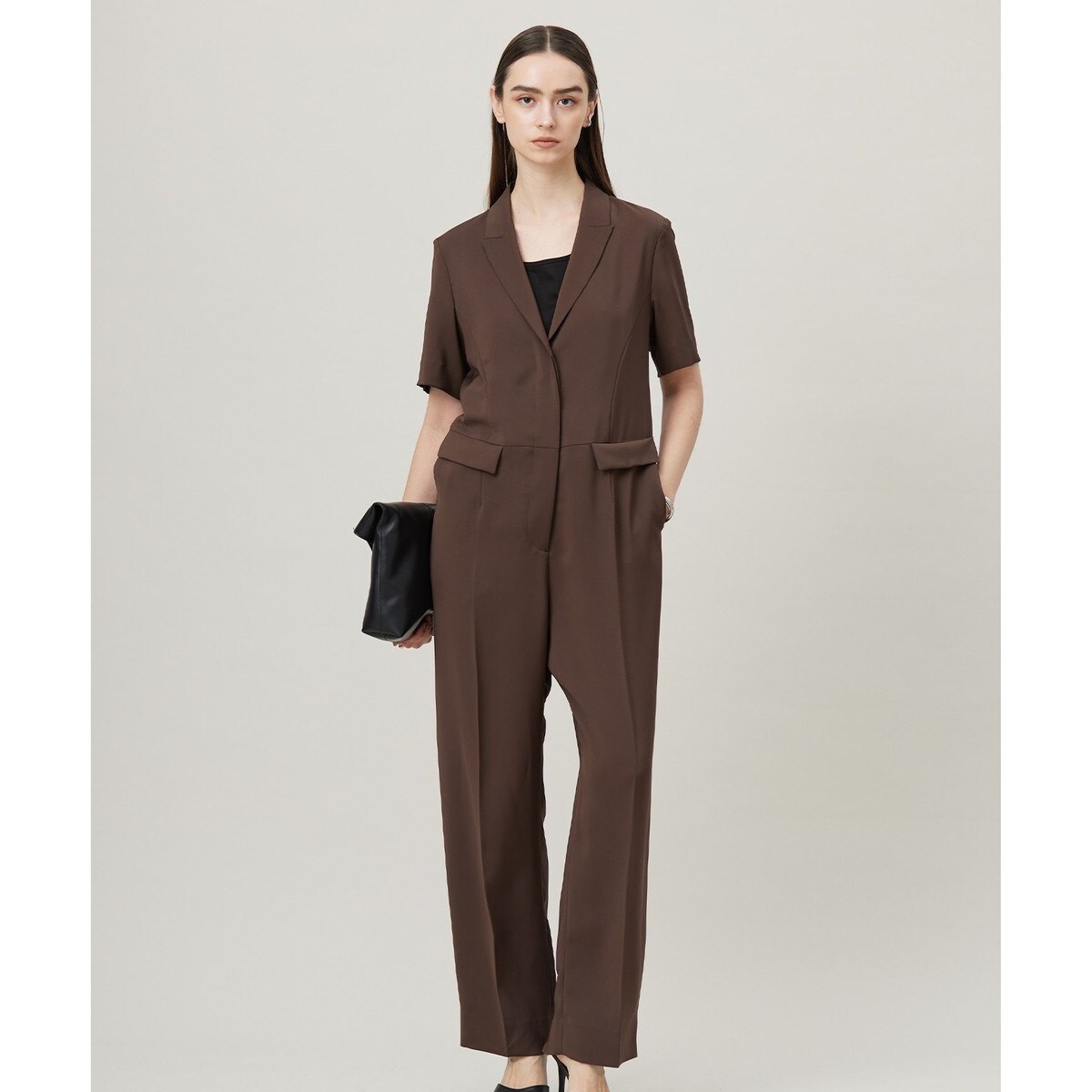 ■デザインマニッシュな印象のテーラーカラーのオールインワンです。スッキリとしたウエストライン、センタープレス入りで脚のラインをキレイに見せるなど、女性らしいシルエットにもこだわっています。一枚で着映えする存在感のあるオールインワンです。