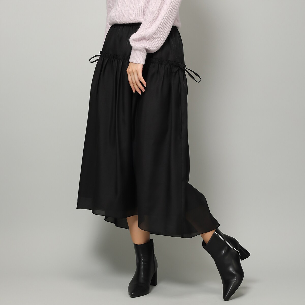 くしゅっとしたギャザー切り替えがフェミニンなムードを高めるスカート。バックのウエストはゴム仕様なので、ラクな着心地を実現します。サイドに施されたリボンがスタイリングのアクセントに。休日のお出かけシーンに重宝したいアイテムです。