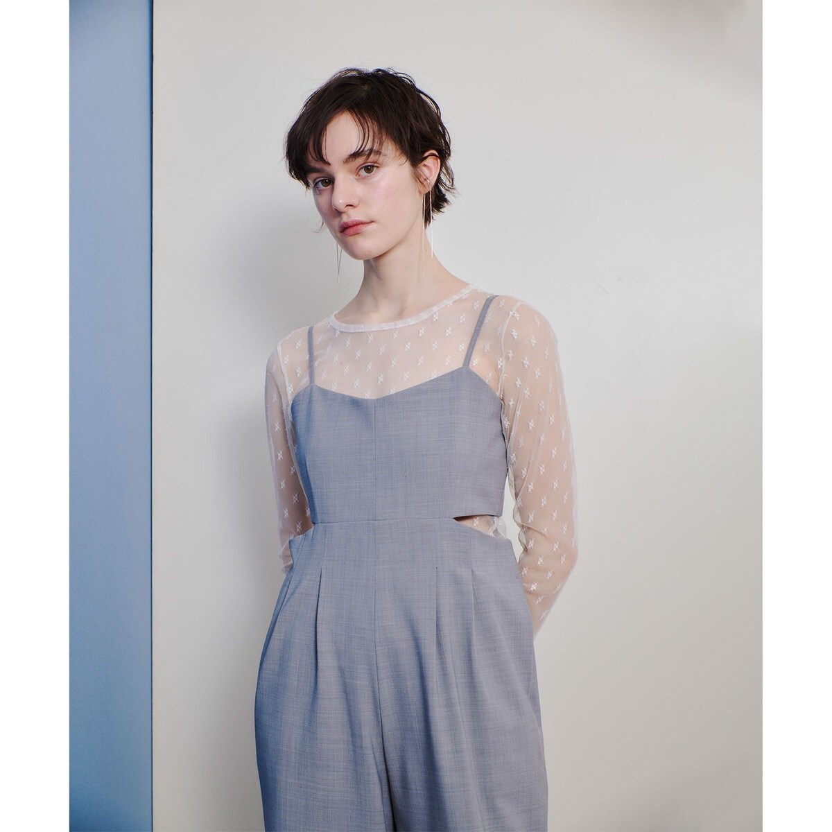 ストレッチトロサロペットパンツ(20251012040)のINでの合わせやショートジレやジャケットのINに着用しやすいサイズ感・衿ぐりになっています。