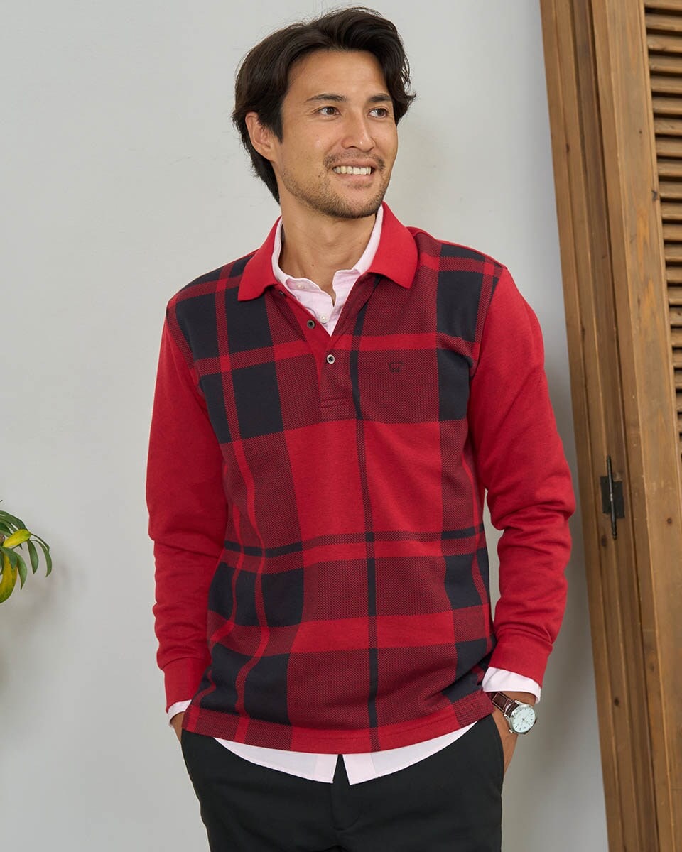 メンズ長袖シャツM レッド系チェック ポロシャツ