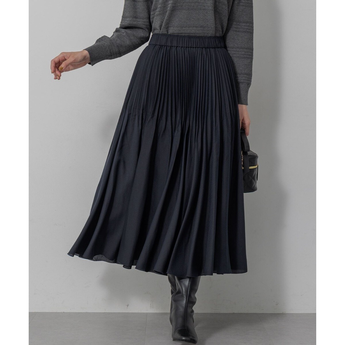 ■デザイン・アコーディオンプリーツスカートは途中からプリーツを消すことで華やかなボリュームがありながら軽やかに仕上げました。・ウエストはオールゴムで着心地よく適度なフィット感が魅力。・素材が柔らかく軽さがあるのでどんなトップスも受け止めてくれるオールシーズン活躍間違いなしのプリーツスカート。