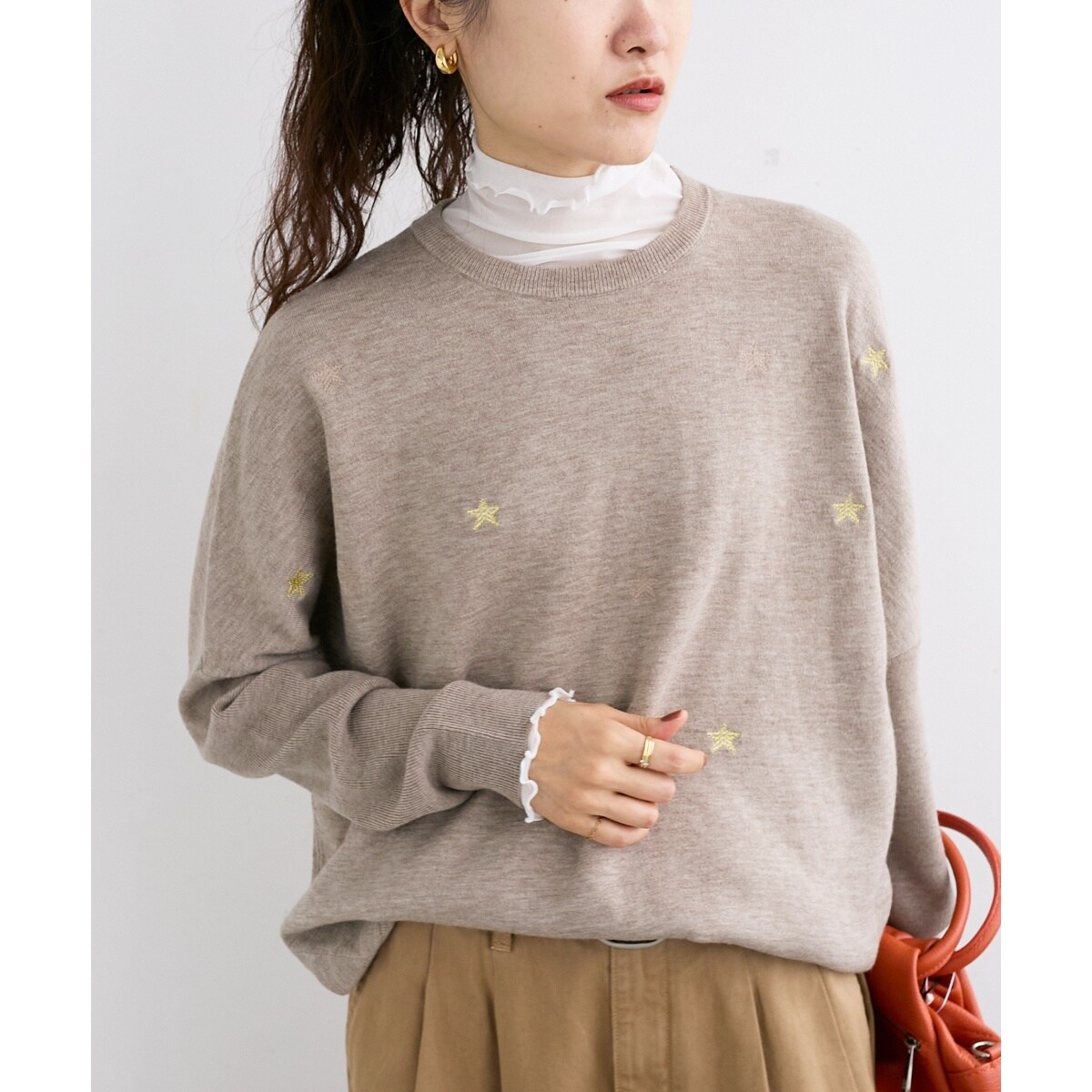 落ち着いたベースカラーにさりげなく散りばめられたスター刺繍がひかるクルーネックニット。