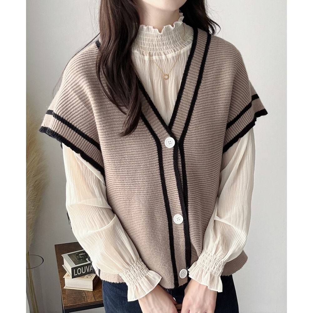 配色ラインVネックボタンニットベスト きれいめ レディース カジュアル レイヤード 秋冬 おしゃれ 着回し 無地 ノースリーブ トップス 散歩 カフェ