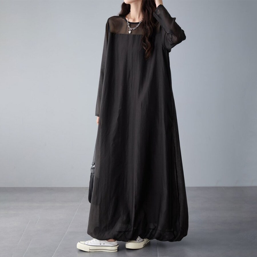 レイヤード風異素材シアー切り替えロングワンピース