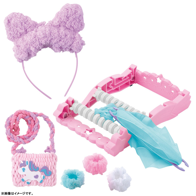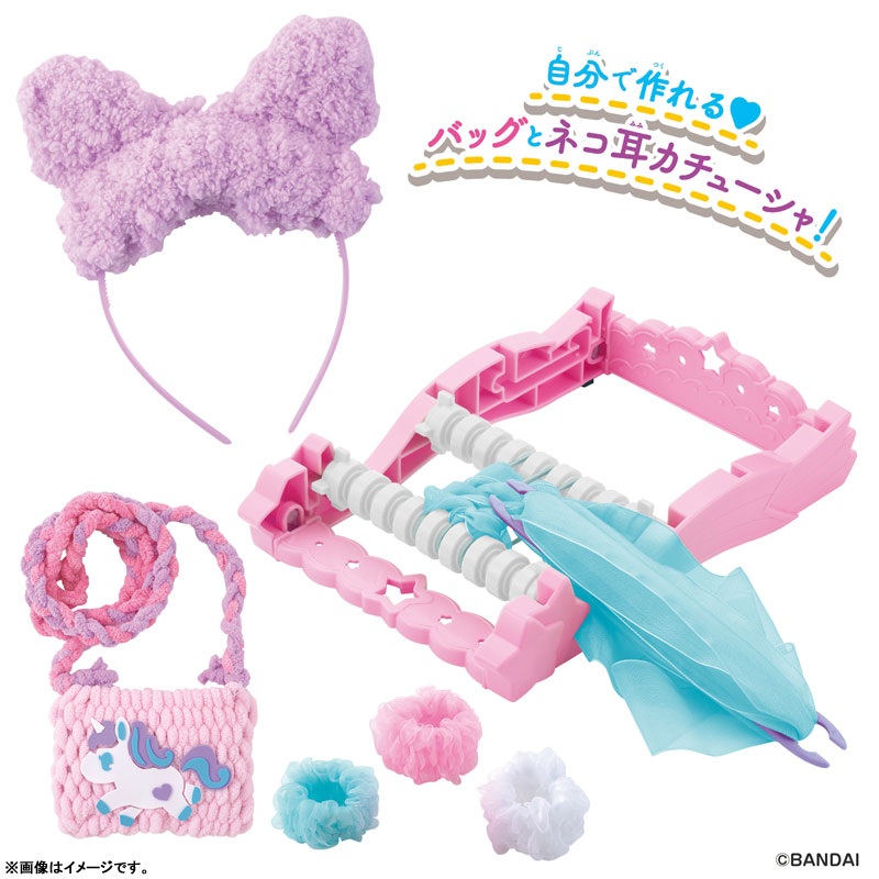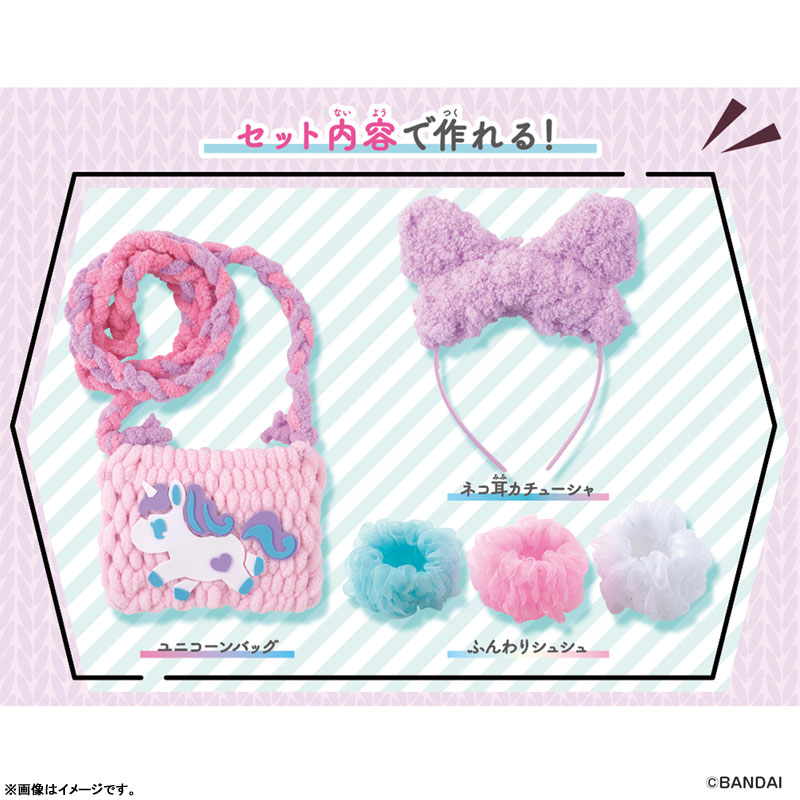 いろいろな素材で簡単にあみものが楽しめるメイキングトイ「アメールアメール」よりネコ耳カチューシャ&バッグが作れるDXセットが登場! セット内容でネコ耳カチューシャ・ユニコーンバッグ・ふんわりシュシュ×3種の合計5種の作例が作れるボリュームたっぷりの商品です。