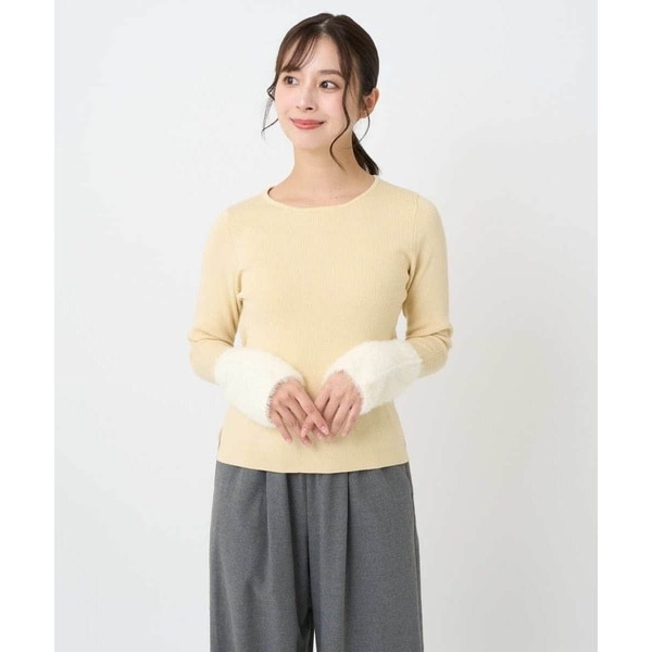 身頃はシンプルなリブ編地、袖口部分は毛足のあるフェザー素材のバランスが大人可愛い雰囲気に。