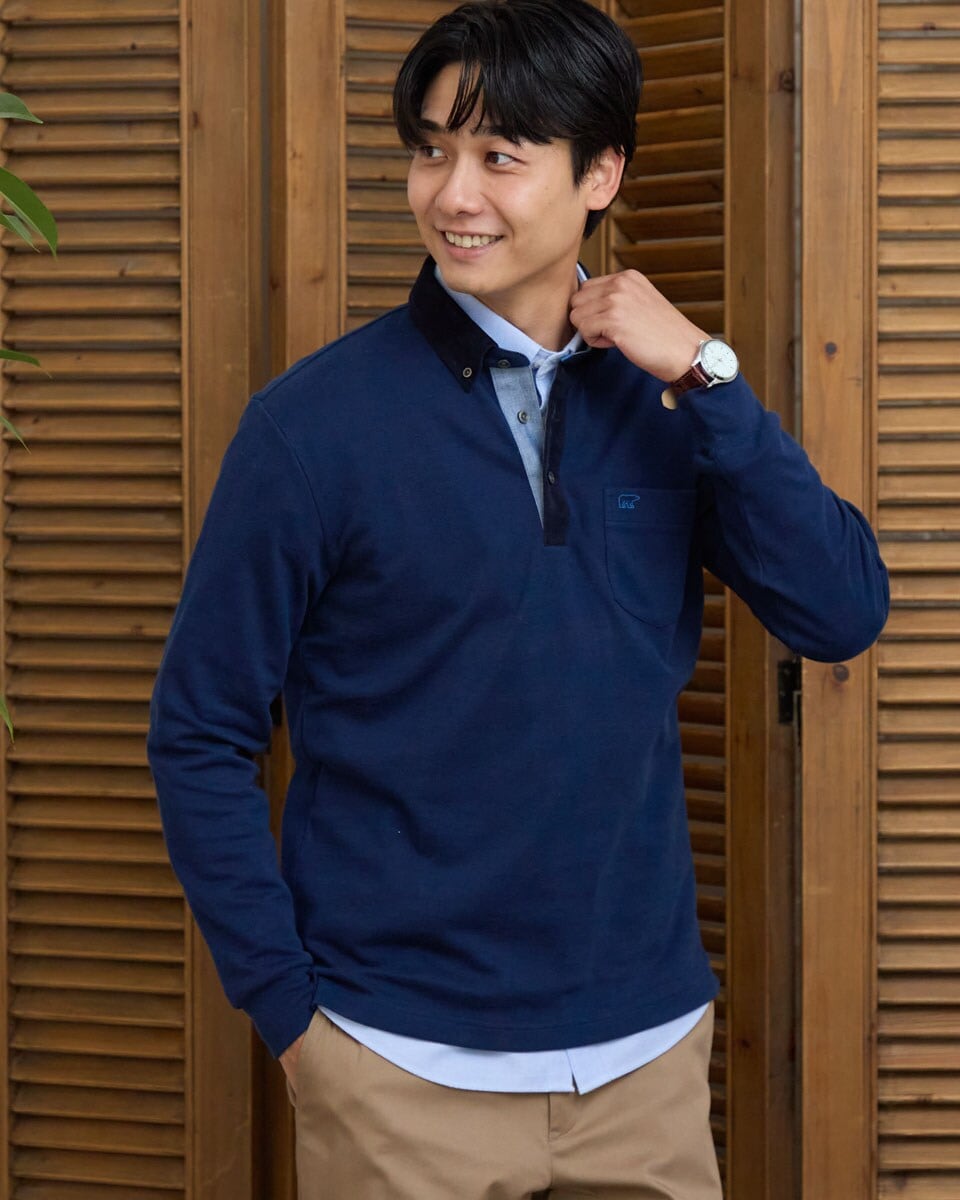 布帛襟長袖ポロシャツ
