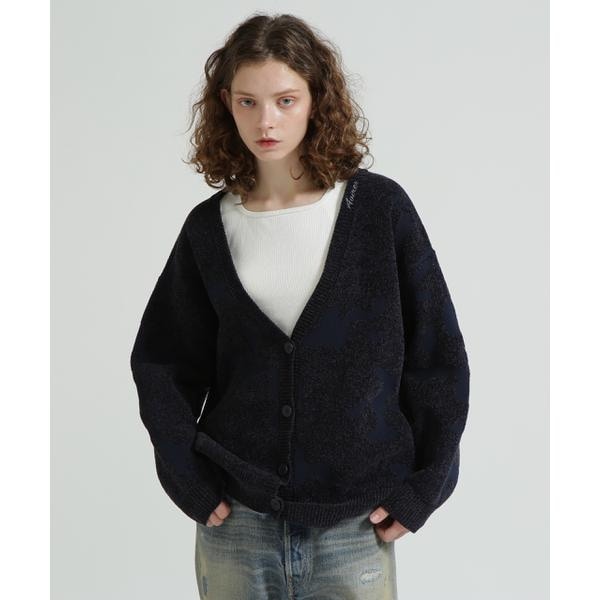 ・大胆なカモフラージュ柄が印象的な、Vネックのニットカーディガン・肌触りの良いジャカード編みニット素材・ドロップショルダーでゆったりしたシルエット【AVIREX WOMAN】本格的なミリタリーウェアが持つ機能性とデザインをレディースカジュアルに投影したライン。個性的かつ時代性のあるレディースブランドとして聡明、自由、好奇心、凛として快活な働く大人の女性へ向けたレディスカジュアルを提案しています。