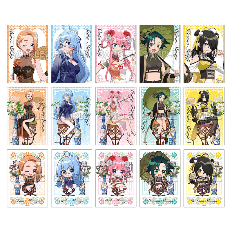1BOX購入で全15種揃います。 TVアニメ「紫雲寺家の子供たち」より、チャイナドレス姿が美しい新規描き下ろしイラストと描き起こしイラストをデザインしたトレーディングブロマイドが登場です。 美しい紫雲寺家の姉妹たちをお部屋にいっぱい飾りたくなるブロマイドです。